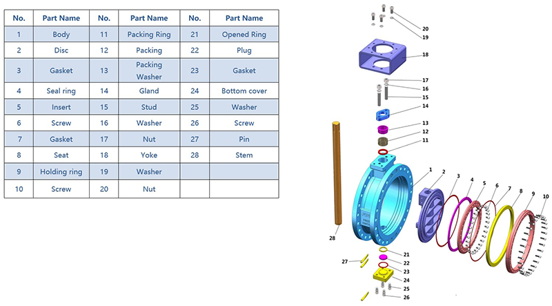 Покомпонентный вид дискового затвора с тройным смещением и цельнометаллическим седлом:
