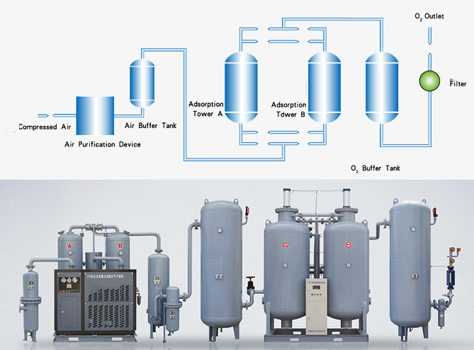 Таким образом, в условиях давления, когда воздух проходит через слой адсорбента, содержащий адсорбент из молекулярного сита цеолита, азот адсорбируется молекулярным ситом, в то время как кислород менее адсорбируется и обогащается газовой фазой и вытекает из слоя адсорбента в отделите газообразный кислород и газообразный азот, чтобы получить газообразный кислород. Когда молекулярное сито адсорбирует азот почти до уровня насыщения, отключите поток воздуха и уменьшите давление слоя адсорбента. Азот, адсорбированный молекулярным ситом, может быть десорбирован, а молекулярное сито регенерировано и использовано повторно. Два или более слоев адсорбента для смены рабочих мест могут непрерывно производить кислород.