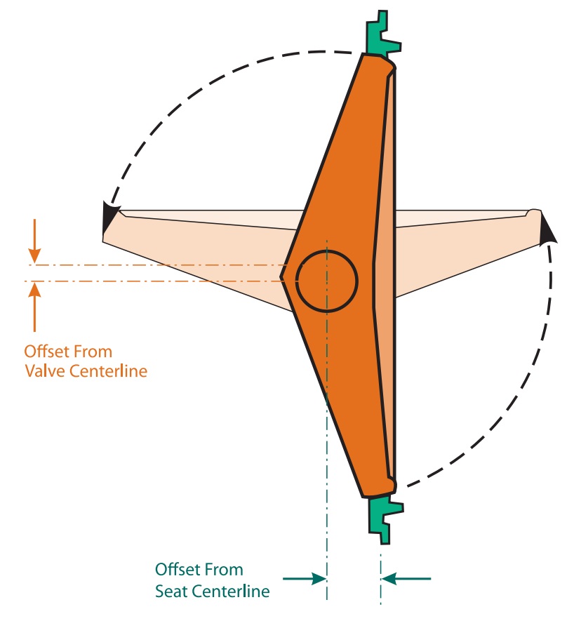 В этой конфигурации диск эксцентричен или смещен относительно седла клапана. Когда диск начинает вращаться, он движется от седла, а не поперек него. В этой конструкции фактически используется давление в линии, чтобы обеспечить герметичность. Эта функция позволяет использовать смещенные дроссельные заслонки в системах с высоким давлением, таких как этанол или системы отопления, вентиляции и кондиционирования. В качестве материала седла обычно используется ПТФЭ или пластик, но доступны также металлические седла, соответствующие спецификациям испытаний на огнестойкость, например API 607.