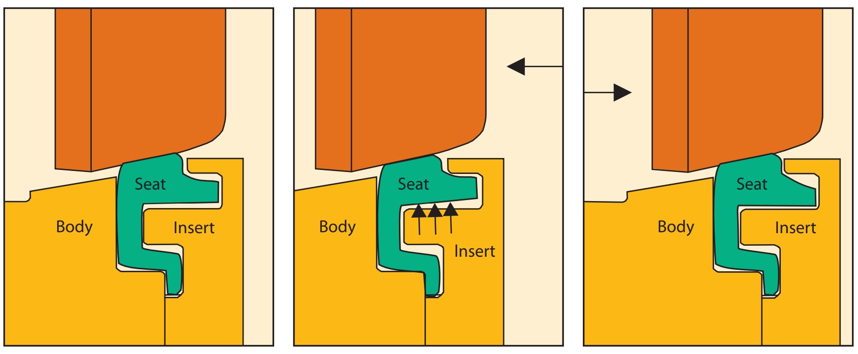 Стандартные дисковые затворы с двойным эксцентриситетом поставляются с полимерным седлом, обычно из ПТФЭ, с металлической опорой для обеспечения пожарной безопасности. Также доступны седла «металл по металлу», которые могут обеспечить более высокое качество уплотнения и допускают несколько более высокие температуры.